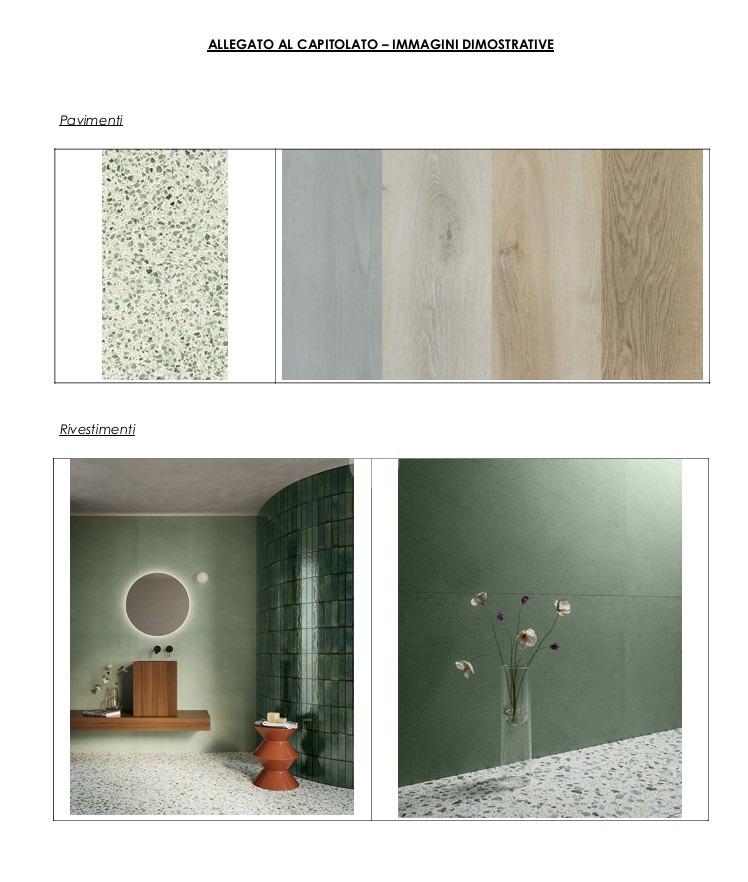 Zona giorno, disimpegni e camere: pavimenti in SPC effetto legno BGP Smart Floors SVR 5/6 EVO (formato 180x22,8 cm, colore a scelta).Bagni: pavimenti e rivestimenti in gres porcellanato Ceramiche Sant’Agostino, serie IRO NEXT AGAVE e AGAVE (formato 60x120 cm).Rivestimento doccia: ceramica smaltata TETRIS FOREST LUX (formato 5x20 cm).Battiscopa in MDF abbinato alle porte interne.Pavimentazione balconi in gres porcellanato per esterni, con zoccolino coordinato.Sanitari e rubinetterie