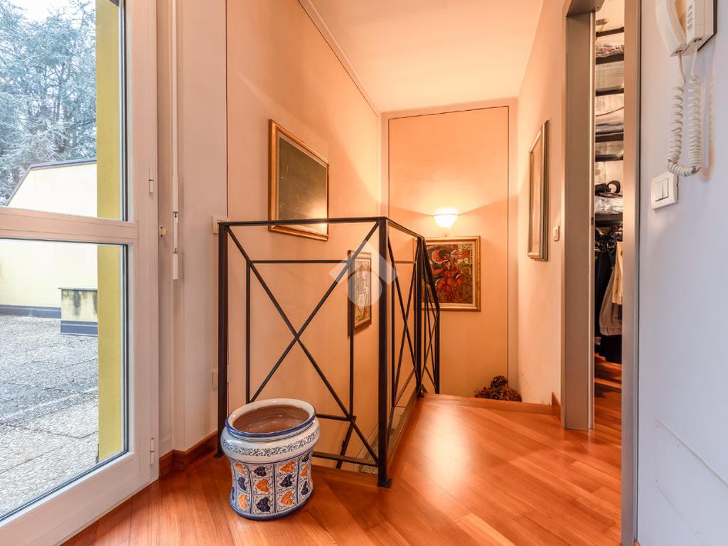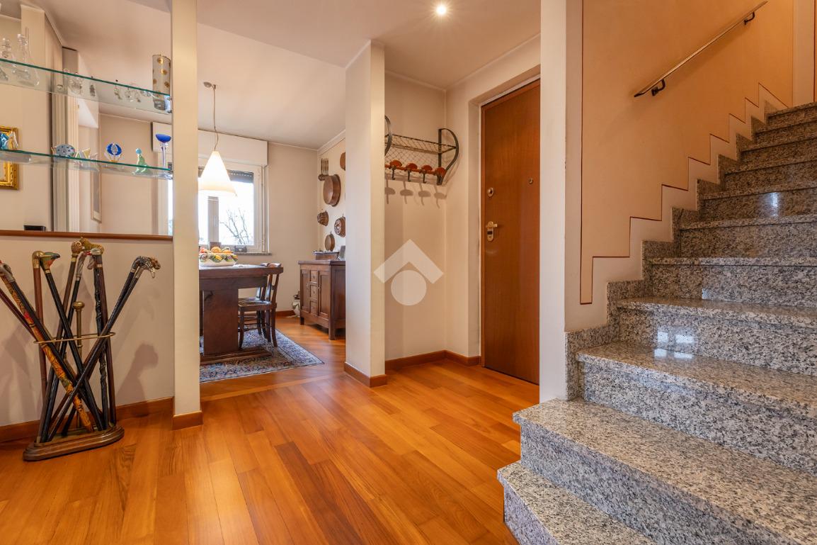 Una scala a giorno dal disimpegno d’ingresso collega il piano superiore.