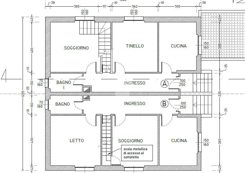 L’immobile, di 332 mq, si sviluppa su più livelli, si compone di due unità abitative attigue, con ingresso pedonale e impianti separati tra loro. Una soluzione, è organizzata tutta su un livello, con la possibilità di recuperare al piano superiore la sua porzione di sottotetto, al fine di creare altre stanze; viceversa l’altra soluzione ha una scala interna che conduce al piano superiore, dove troviamo da tre camere da letto e un bagno. Entrambe le soluzioni dispongono a piano rialzato di cucina abitabile, soggiorno, bagno e già una camera da letto sul piano.
